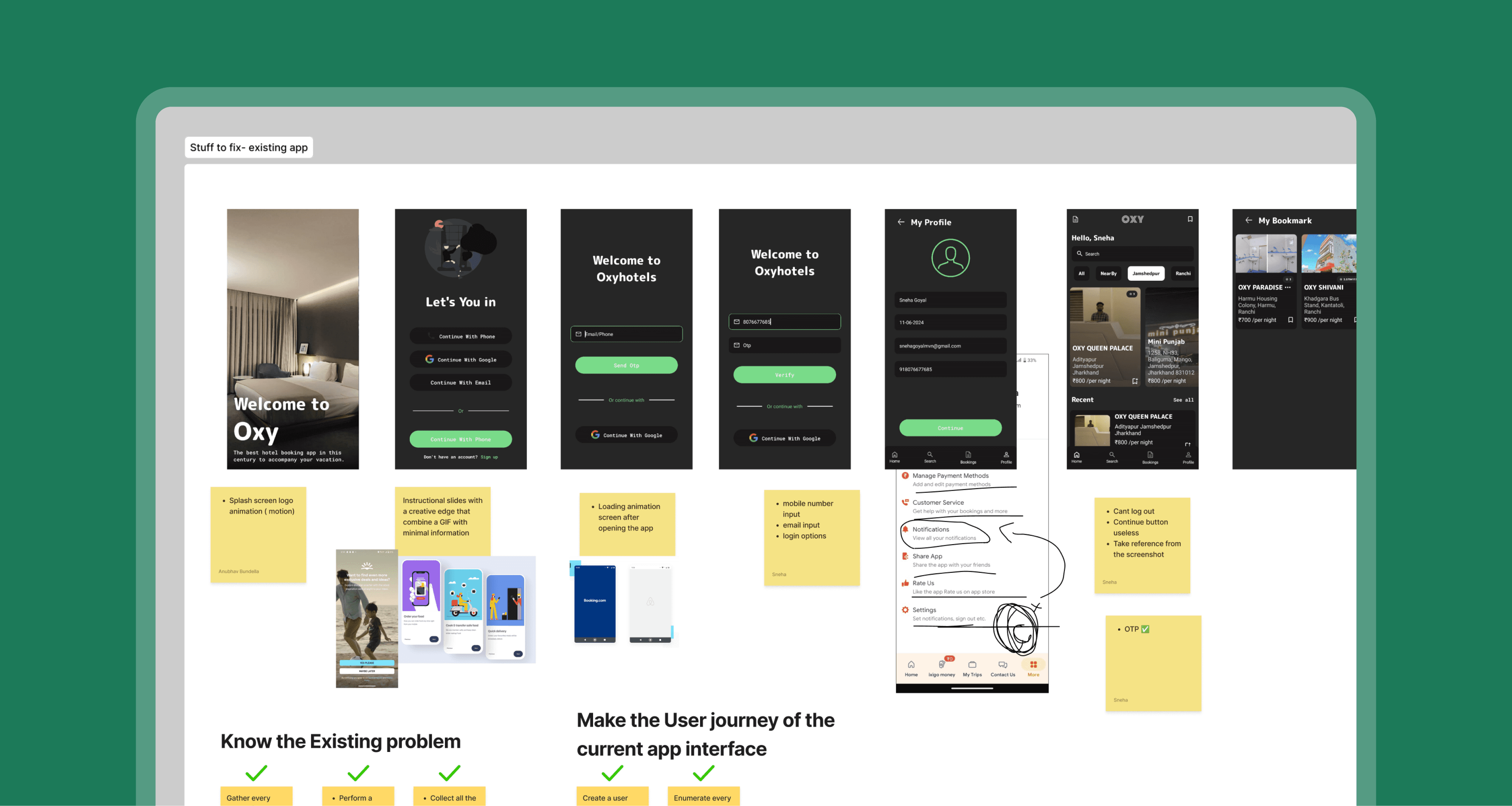 laid down the existing app screenshots and design flaws to be fixed